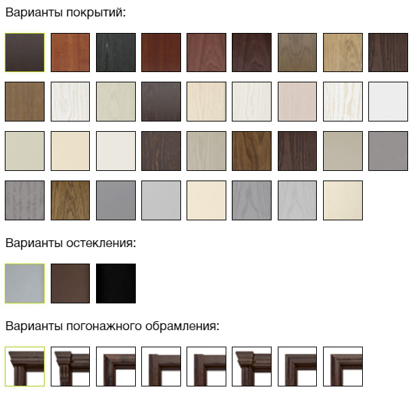 Цвет шпона: венге, абрикос, ясень античный, ясень кремовый, ясень платина, ясень маренго, эмаль кремовая, эмаль платина, эмаль маренго, красное дерево, темное красное дерево, анегри, анегри черешня, ясень чёрный, ясень белый, ясень слон.кость, ясень венге, ясень карамель, ясень жасмин, ясень графит, ясень капучино, беленый дуб, эмаль белая, эмаль слоновая кость, эмаль карамель, эмаль жасмин, эмаль графит, эмаль капучино.